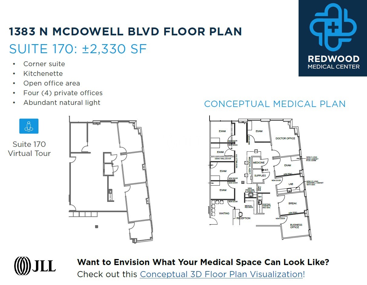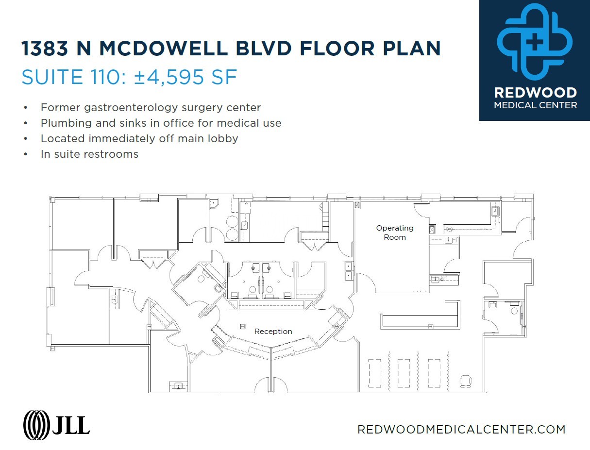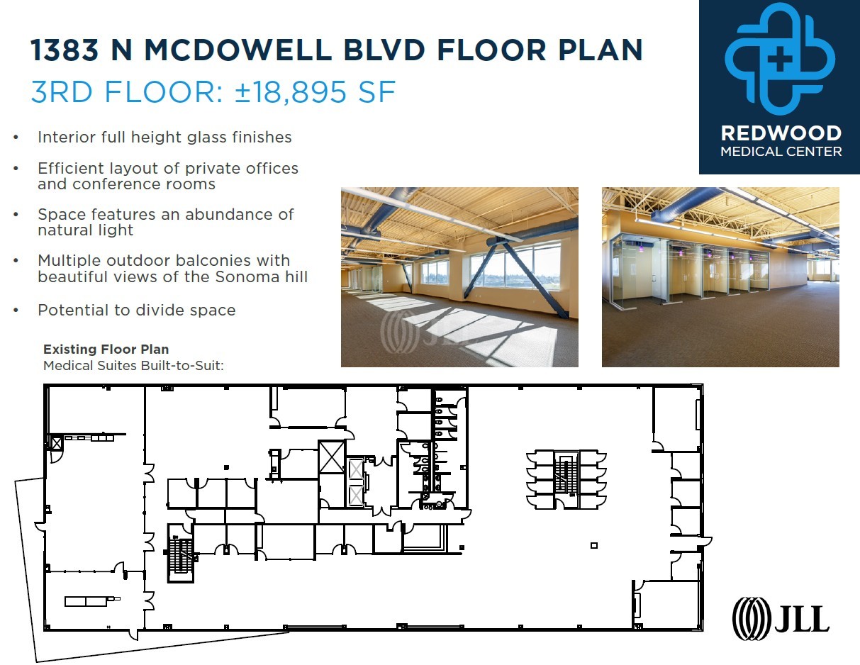 Basin Street Properties has repositioned 1383 North McDowell Boulevard as Redwood Medical Center to address Petaluma's growing healthcare demand. The facility offers versatile, ADA and HIPAA-compliant medical spaces with customizable layouts for a variety of practices. The project is conveniently located right off Highway 101 and is within walking distance to retail, dining, and fitness amenities. Medical providers and patients benefit from ample free parking, modern infrastructure with updated HVAC systems, and onsite backup power generation.