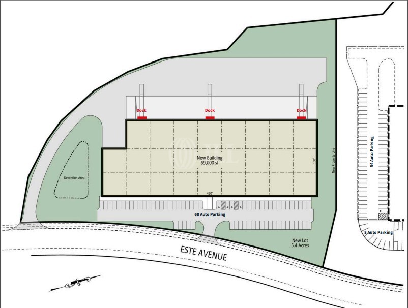 This BTS features a 69,000-square-foot building, expertly designed with dimensions of 160' by 450'. Situated on a spacious 5.4-acre lot, the site offers ample space for your business needs. With frontage along Este Avenue and a dedicated detention area, this property combines accessibility with smart design.