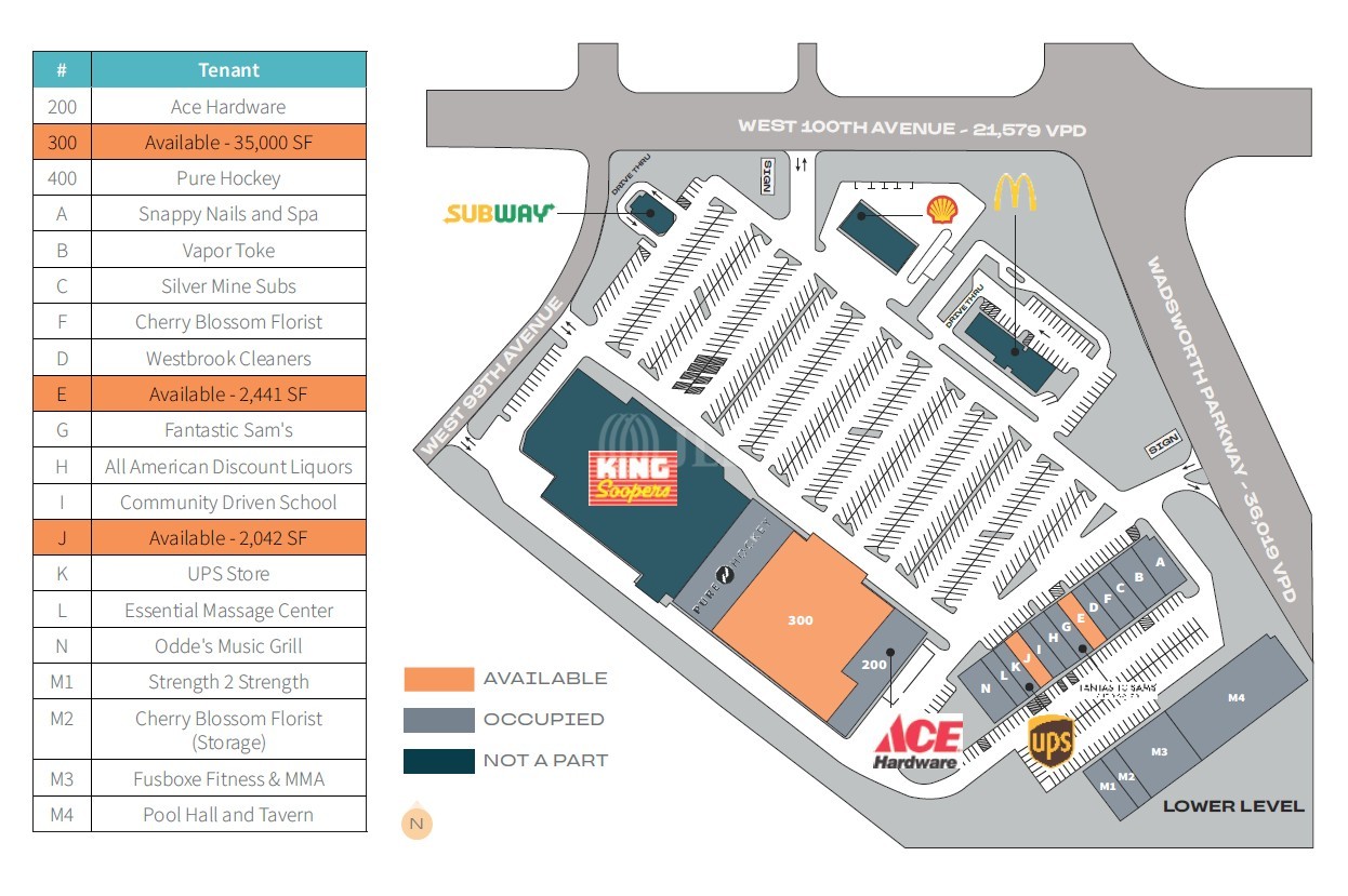 Standley Shores offers 35,000 SF of prime retail space in a thriving King Soopers-anchored center, positioned among established retailers like Ace Hardware, McDonald's, and UPS at the busy intersection of W 100th Avenue and Wadsworth Parkway in Westminster, CO.